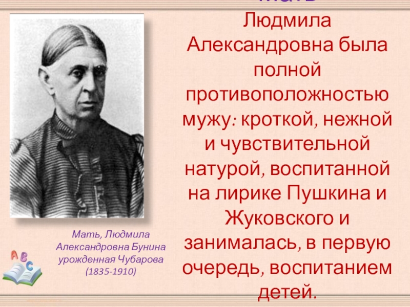 натурой, воспитанной на лирике Пушкина и Жуковского и занималась, в первую очередь, воспитанием детей.