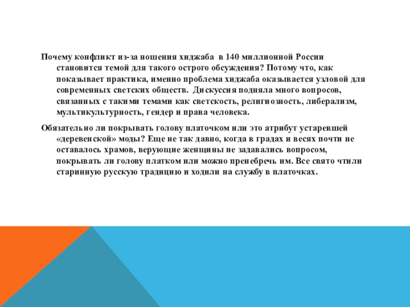 для такого острого обсуждения? Потому что, как показывает практика, именно проблема хиджаба оказывается узловой для современных светских обществ. Дискуссия подняла много вопросов, связанных с такими темами как светскость, религиозность, либерализм, мультикультурность, гендер и права человека.