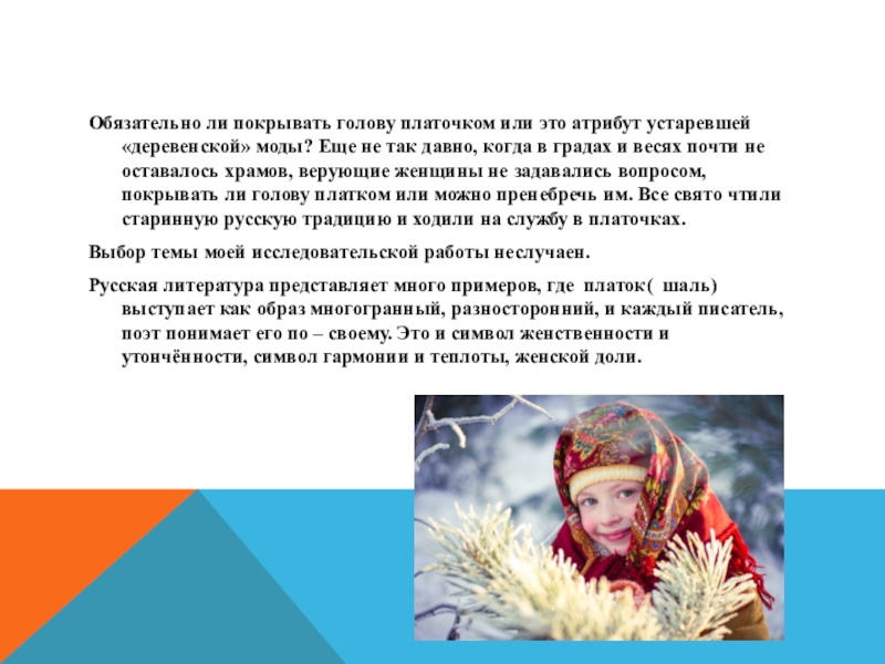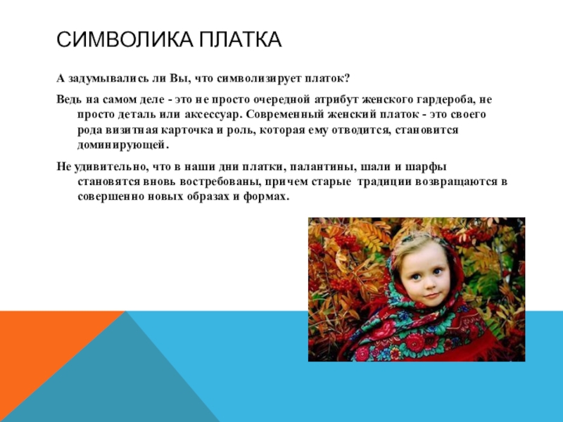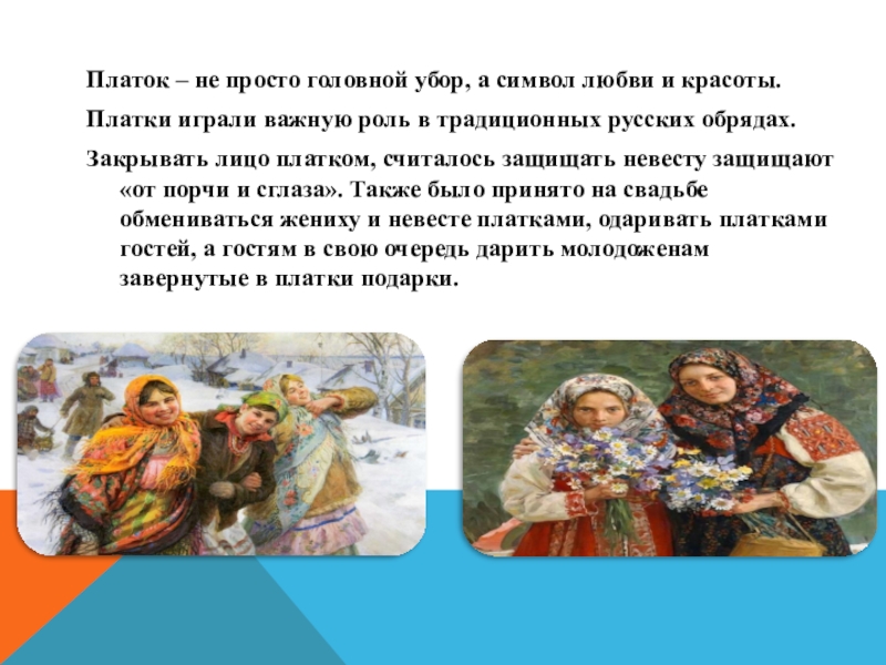 Слайд 15Платок – не просто головной убор, а символ любви и красоты.