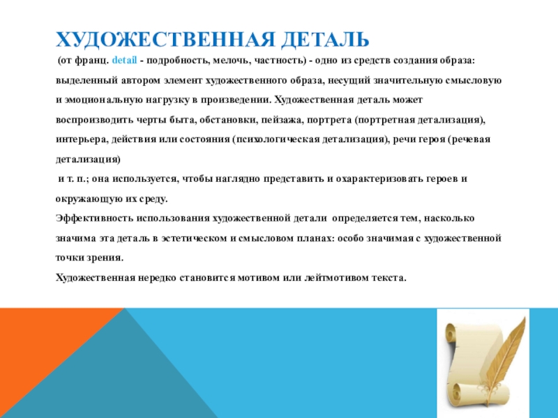 из средств создания образа: выделенный автором элемент художественного образа, несущий значительную смысловую и эмоциональную нагрузку в произведении. Художественная деталь может воспроизводить черты быта, обстановки, пейзажа, портрета (портретная детализация), интерьера, действия или состояния (психологическая детализация), речи героя (речевая детализация)