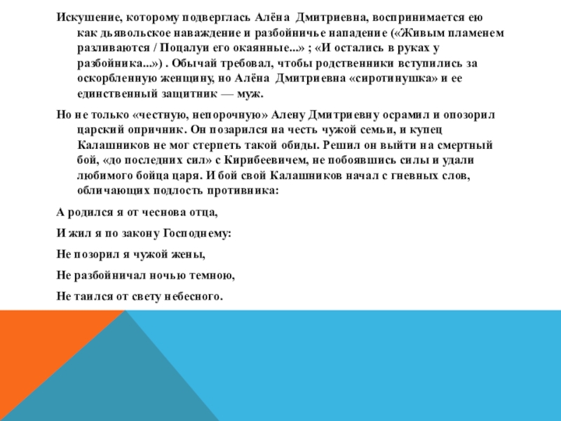 семейно-родовым укладом. Замужняя женщина блюдет покой и быт семьи: встречает мужа, обихаживает детей, ходит в церковь и ведет замкнутый образ жизни, строго определенный обычаем. Образ Алёны Дмитриевны играет в поэме исключительно важную содержательную роль. Степан Калашников изумлен, видя свою жену «простоволосой», т. е. без платка на голове, без фаты, прикрывающей лицо, с расплетенными косами, растрепанными волосами. Появление замужней женщины в неубранном виде — позор для мужа и намек на ее грешные приключения.