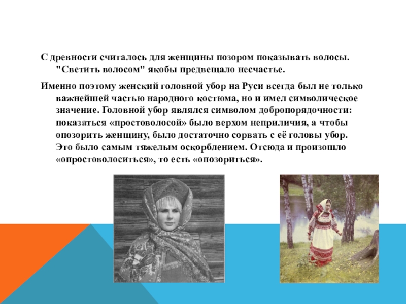 Слайд 16С древности считалось для женщины позором показывать волосы. "Светить волосом" якобы
