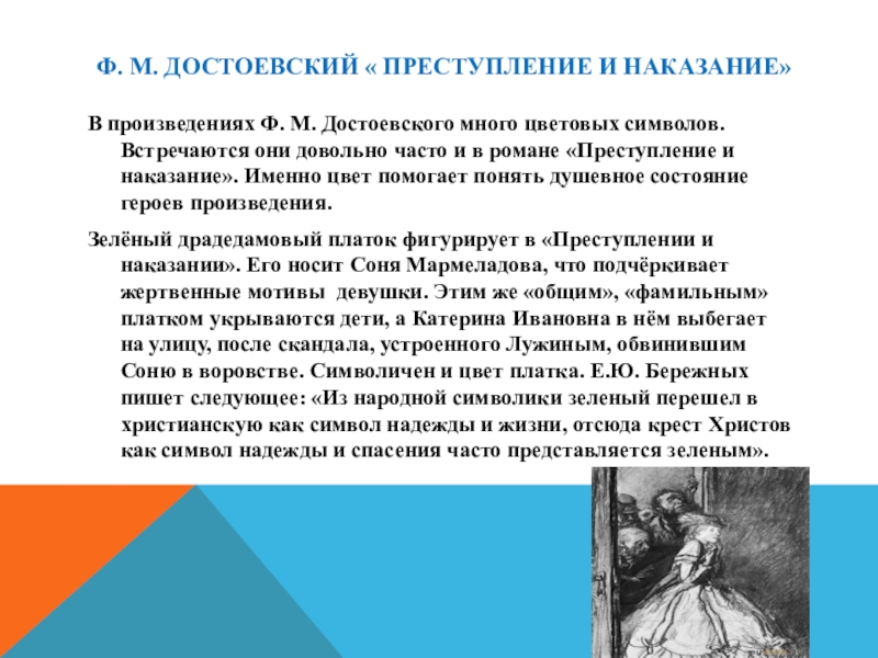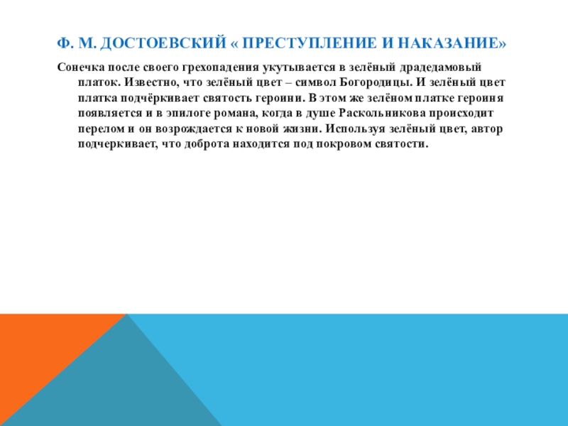 в зелёный драдедамовый платок. Известно, что зелёный цвет – символ Богородицы. И зелёный цвет платка подчёркивает святость героини. В этом же зелёном платке героиня появляется и в эпилоге романа, когда в душе Раскольникова происходит перелом и он возрождается к новой жизни. Используя зелёный цвет, автор подчеркивает, что доброта находится под покровом святости.