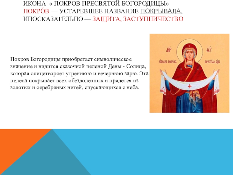 Слайд 13ИКОНА « ПОКРОВ ПРЕСВЯТОЙ БОГОРОДИЦЫ»