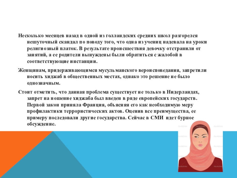 Стоит отметить, что данная проблема существует не только в Нидерландах, запрет на ношение хиджаба был введен в ряде европейских государств. Первой закон приняла Франция, объясняя его как необходимую меру профилактики террористических актов. Оценив все преимущества, ее примеру последовали другие государства. Сейчас в СМИ идет бурное обсуждение.