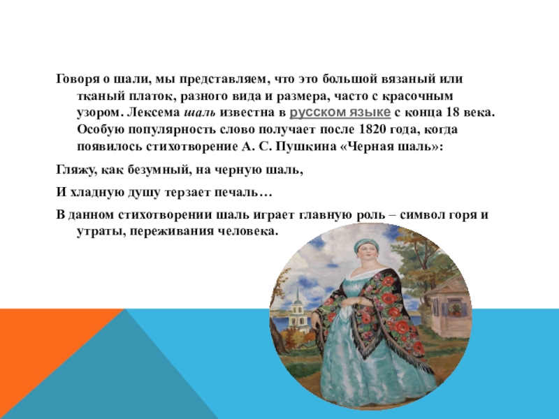 платок, разного вида и размера, часто с красочным узором. Лексема шаль известна в русском языке с конца 18 века. Особую популярность слово получает после 1820 года, когда появилось стихотворение А. С. Пушкина «Черная шаль»: