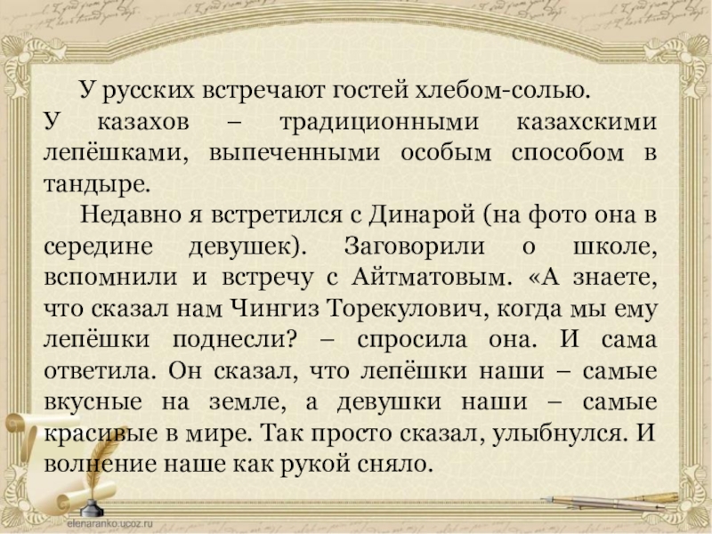 Недавно я встретился с Динарой (на фото она в середине девушек). Заговорили о школе, вспомнили и встречу с Айтматовым. «А знаете, что сказал нам Чингиз Торекулович, когда мы ему лепёшки поднесли? – спросила она. И сама ответила. Он сказал, что лепёшки наши – самые вкусные на земле, а девушки наши – самые красивые в мире. Так просто сказал, улыбнулся. И волнение наше как рукой сняло.