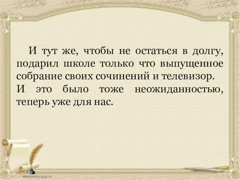 Слайд 26 И тут же, чтобы не остаться в долгу, подарил школе только