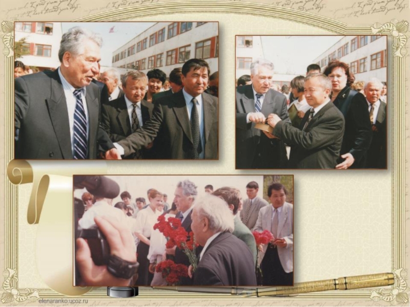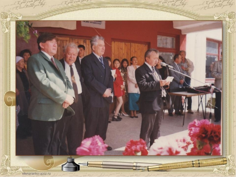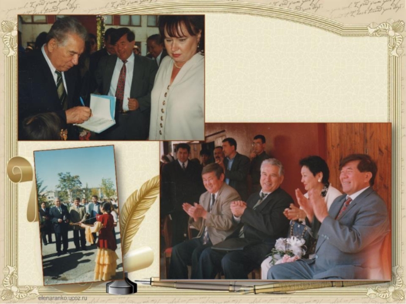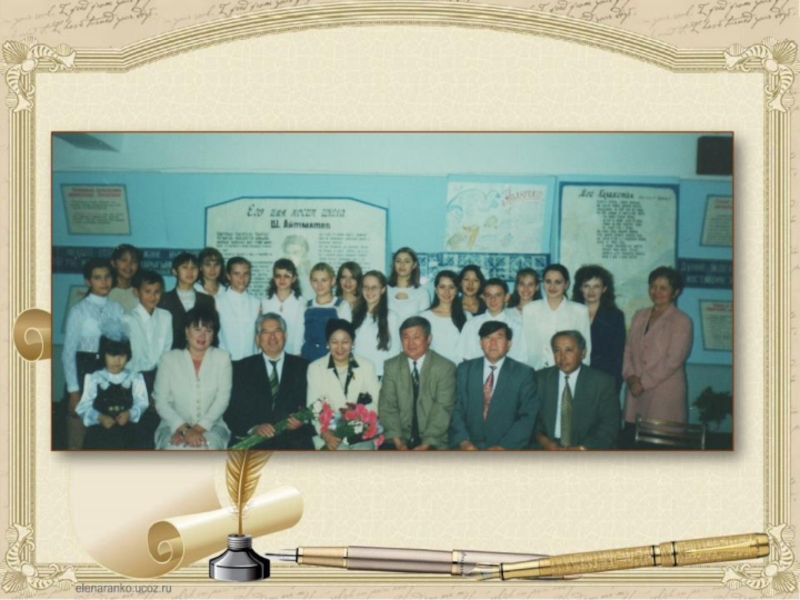 рассказали об истории школы, о наших достижениях. «Не каждая школа, даже у нас в Киргизии, может похвастаться такими экспонатами. Обязательно пришлю что-нибудь из своих…, - тут Чингиз Торекулович немного запнулся, видимо, хотел сказать «вещей», но тут же добавил, - мне дорогих принадлежностей. Пусть, если вы не возражаете, напоминают они и в вашем городе, и в вашей школе о нашей встрече». И Айтматов сдержал слово. Через некоторое время мы получили посылку, в которой были настенные часы Айтматова, его письменный настольный прибор и фотографии, на которых писатель был запечатлён в поездке по Казахстану.