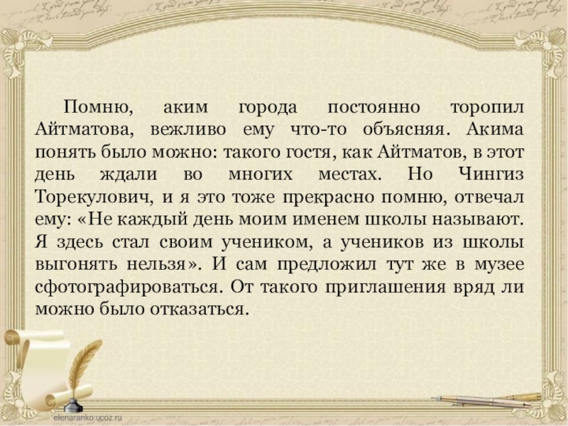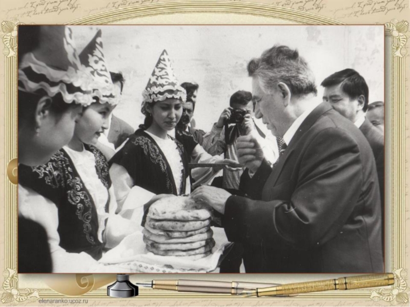 Слайд 38 Помню, аким города постоянно торопил Айтматова, вежливо ему что-то объясняя. Акима