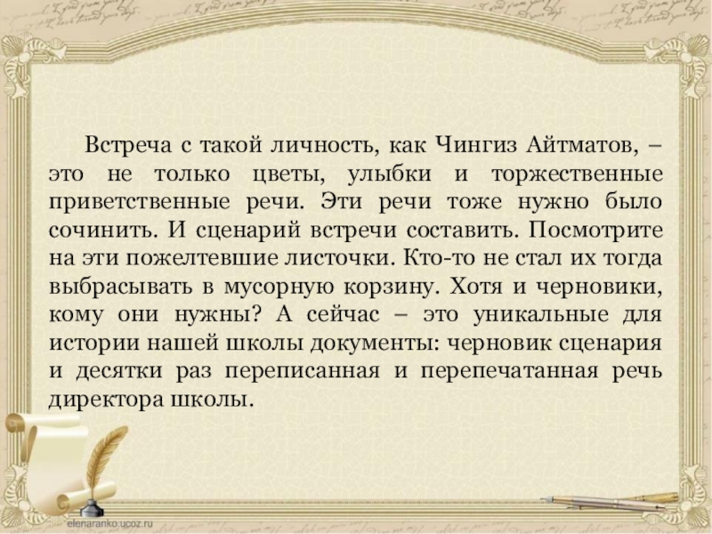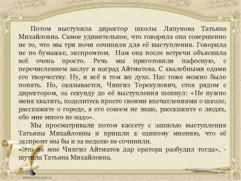 она совершенно не то, что мы три ночи сочиняли для её выступления. Говорила не по бумажке, экспромтом. Нам она после встречи объяснила всё очень просто. Речь мы приготовили пафосную, с перечислением заслуг и наград Айтматова. С хвалебными одами его творчеству. Ну, и всё в том же духе. Нас тоже можно было понять. Но, оказывается, Чингиз Торекулович, стоя рядом с директором, за секунду до её выступления шепнул: «Не нужно меня хвалить, поделитесь просто своими впечатлениями о школе, расскажите о городе, я его совсем не знаю, расскажите о людях, обо мне много не надо».