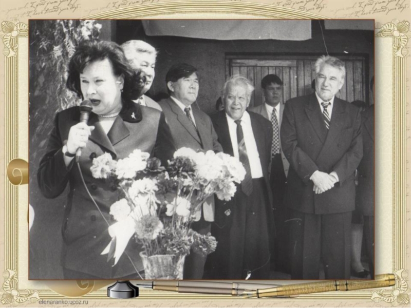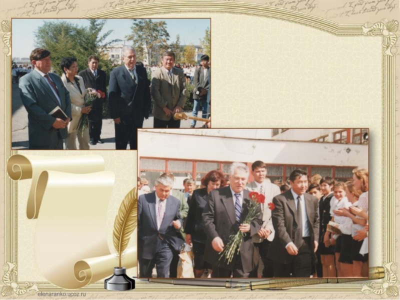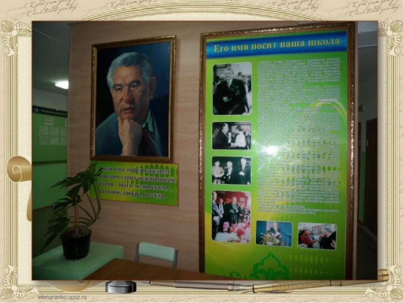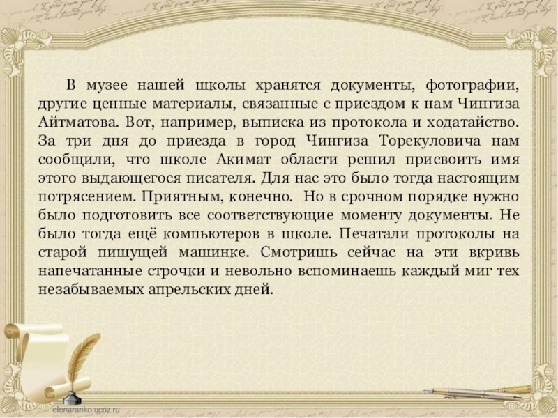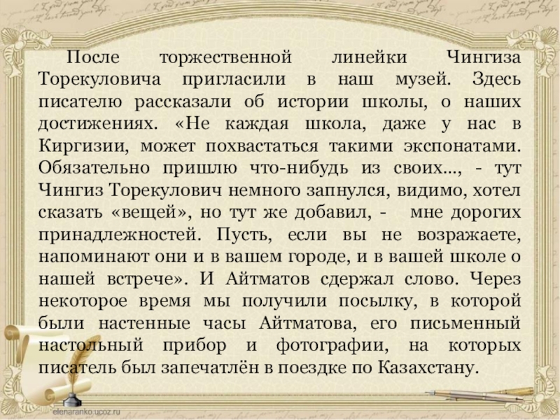 Слайд 30 После торжественной линейки Чингиза Торекуловича пригласили в наш музей. Здесь писателю