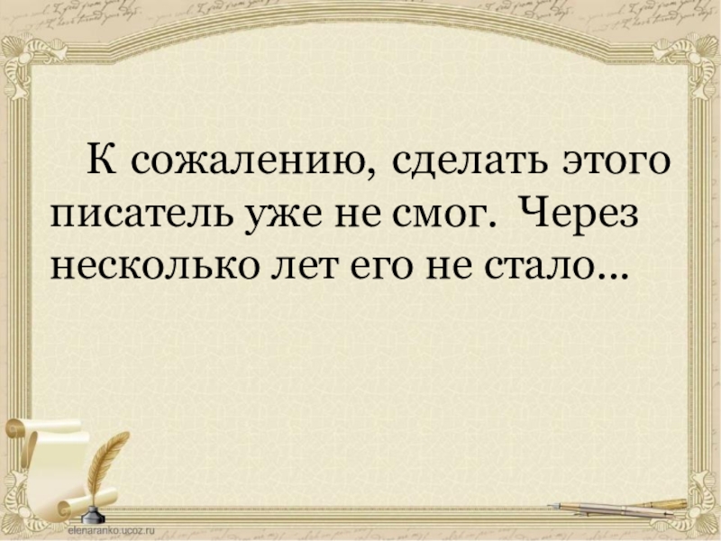 Слайд 42 К сожалению, сделать этого писатель уже не смог. Через несколько лет