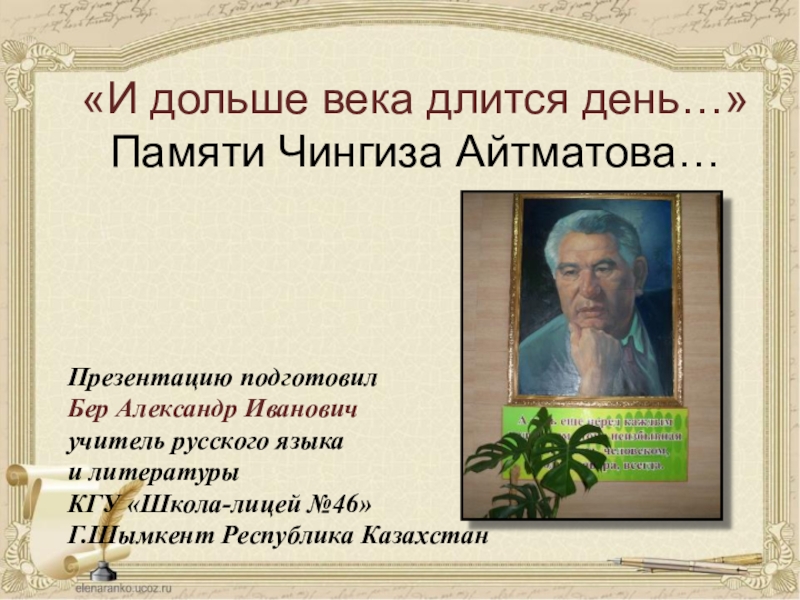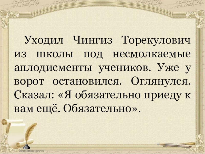 Слайд 40 Уходил Чингиз Торекулович из школы под несмолкаемые аплодисменты учеников. Уже у