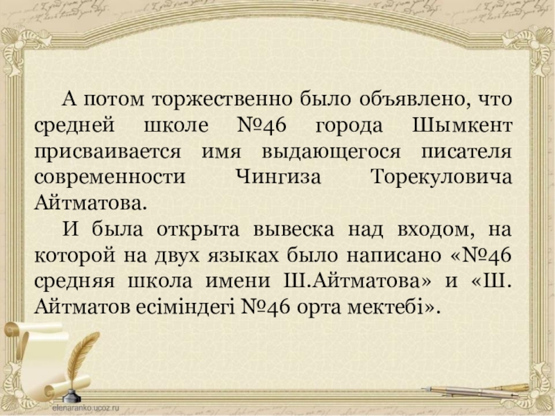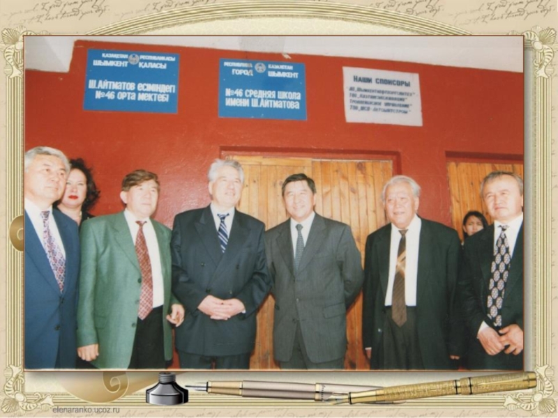И была открыта вывеска над входом, на которой на двух языках было написано «№46 средняя школа имени Ш.Айтматова» и «Ш.Айтматов есіміндегі №46 орта мектебі».