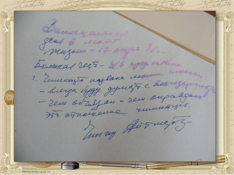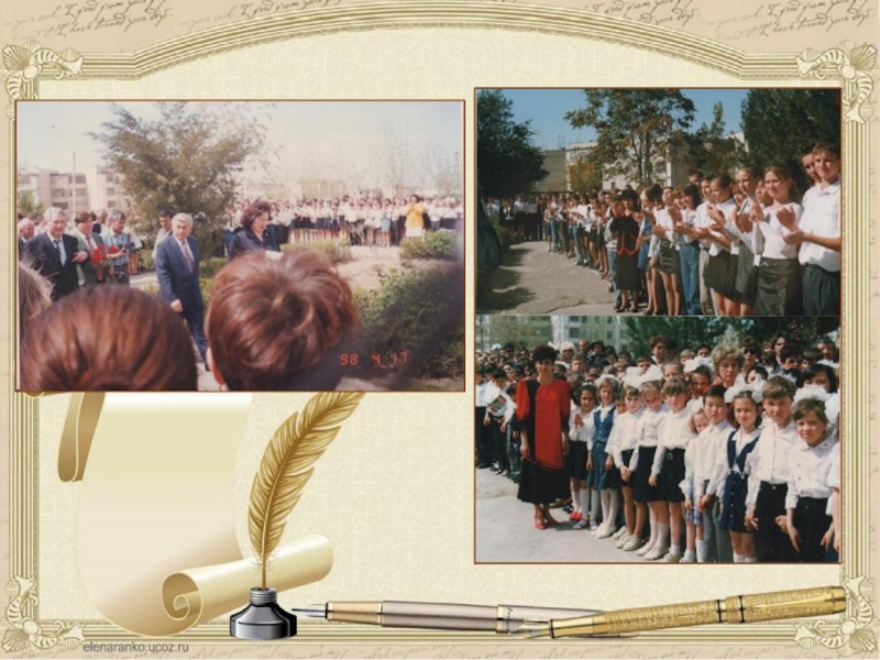 цветы, улыбки и торжественные приветственные речи. Эти речи тоже нужно было сочинить. И сценарий встречи составить. Посмотрите на эти пожелтевшие листочки. Кто-то не стал их тогда выбрасывать в мусорную корзину. Хотя и черновики, кому они нужны? А сейчас – это уникальные для истории нашей школы документы: черновик сценария и десятки раз переписанная и перепечатанная речь директора школы.