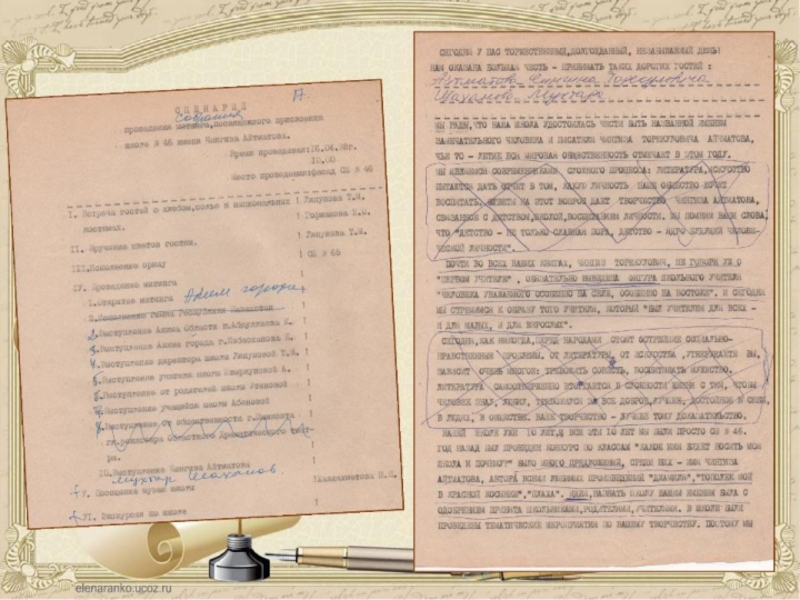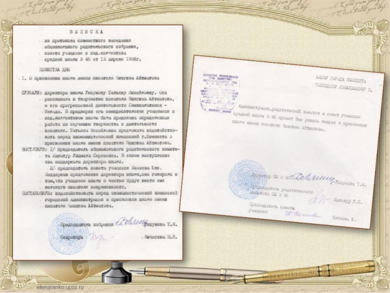 с приездом к нам Чингиза Айтматова. Вот, например, выписка из протокола и ходатайство. За три дня до приезда в город Чингиза Торекуловича нам сообщили, что школе Акимат области решил присвоить имя этого выдающегося писателя. Для нас это было тогда настоящим потрясением. Приятным, конечно. Но в срочном порядке нужно было подготовить все соответствующие моменту документы. Не было тогда ещё компьютеров в школе. Печатали протоколы на старой пишущей машинке. Смотришь сейчас на эти вкривь напечатанные строчки и невольно вспоминаешь каждый миг тех незабываемых апрельских дней.