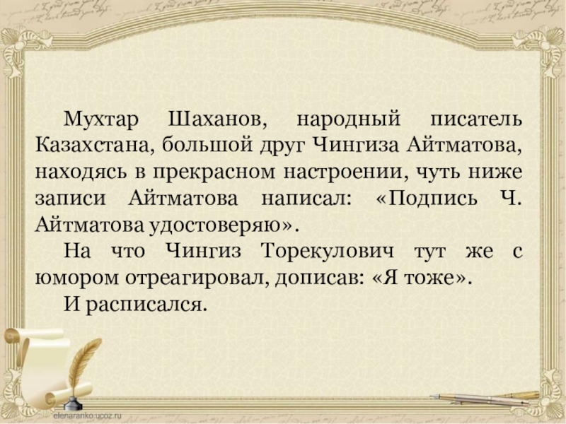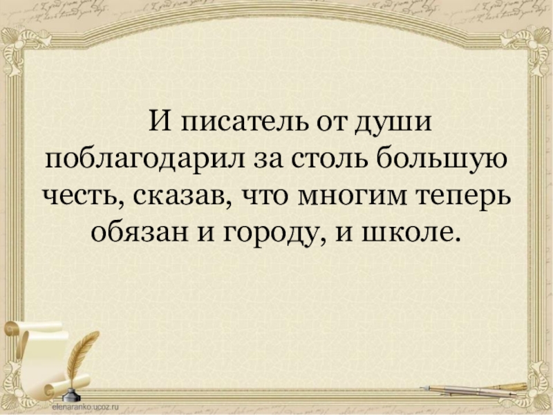 Слайд 24 И писатель от души поблагодарил за столь большую честь, сказав, что