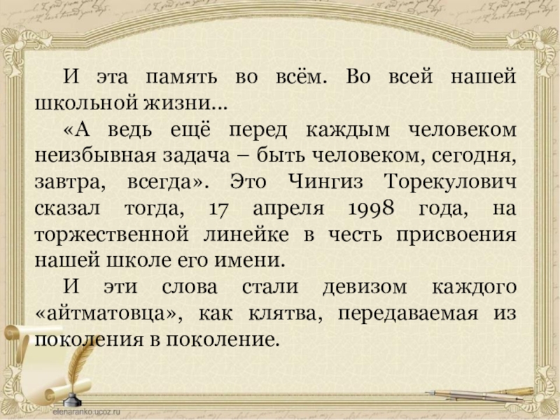 ещё перед каждым человеком неизбывная задача – быть человеком, сегодня, завтра, всегда». Это Чингиз Торекулович сказал тогда, 17 апреля 1998 года, на торжественной линейке в честь присвоения нашей школе его имени.