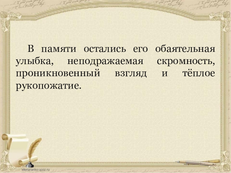 Слайд 44 В памяти остались его обаятельная улыбка, неподражаемая скромность, проникновенный взгляд и