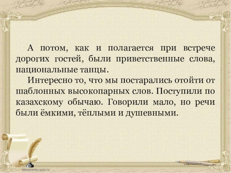 Слайд 14 А потом, как и полагается при встрече дорогих гостей, были приветственные