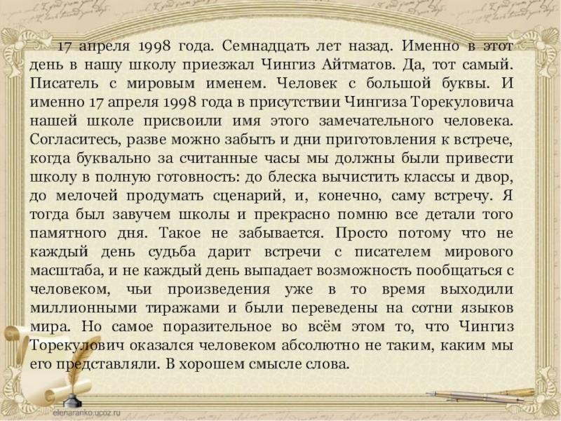 в нашу школу приезжал Чингиз Айтматов. Да, тот самый. Писатель с мировым именем. Человек с большой буквы. И именно 17 апреля 1998 года в присутствии Чингиза Торекуловича нашей школе присвоили имя этого замечательного человека. Согласитесь, разве можно забыть и дни приготовления к встрече, когда буквально за считанные часы мы должны были привести школу в полную готовность: до блеска вычистить классы и двор, до мелочей продумать сценарий, и, конечно, саму встречу. Я тогда был завучем школы и прекрасно помню все детали того памятного дня. Такое не забывается. Просто потому что не каждый день судьба дарит встречи с писателем мирового масштаба, и не каждый день выпадает возможность пообщаться с человеком, чьи произведения уже в то время выходили миллионными тиражами и были переведены на сотни языков мира. Но самое поразительное во всём этом то, что Чингиз Торекулович оказался человеком абсолютно не таким, каким мы его представляли. В хорошем смысле слова.