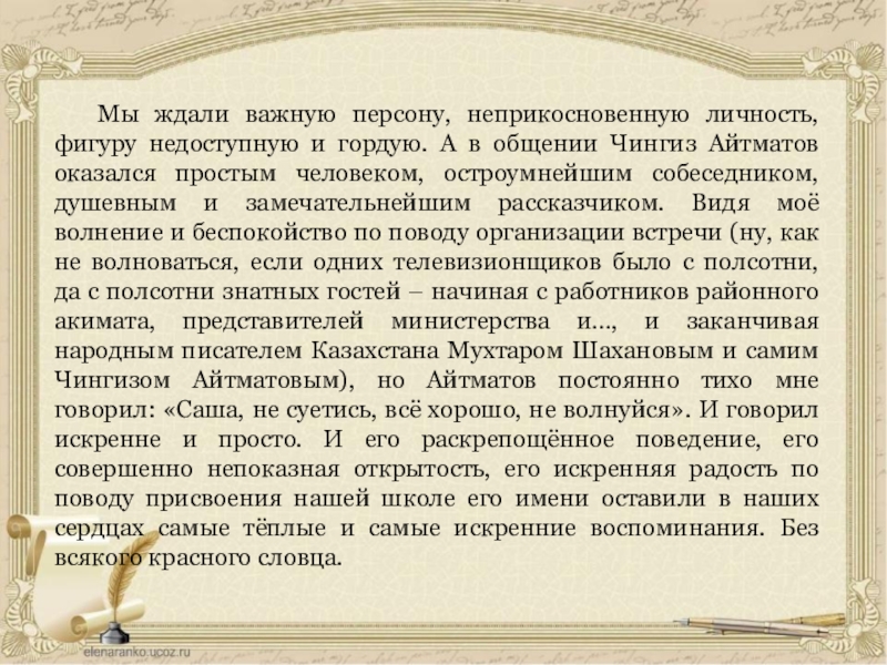 в общении Чингиз Айтматов оказался простым человеком, остроумнейшим собеседником, душевным и замечательнейшим рассказчиком. Видя моё волнение и беспокойство по поводу организации встречи (ну, как не волноваться, если одних телевизионщиков было с полсотни, да с полсотни знатных гостей – начиная с работников районного акимата, представителей министерства и…, и заканчивая народным писателем Казахстана Мухтаром Шахановым и самим Чингизом Айтматовым), но Айтматов постоянно тихо мне говорил: «Саша, не суетись, всё хорошо, не волнуйся». И говорил искренне и просто. И его раскрепощённое поведение, его совершенно непоказная открытость, его искренняя радость по поводу присвоения нашей школе его имени оставили в наших сердцах самые тёплые и самые искренние воспоминания. Без всякого красного словца.