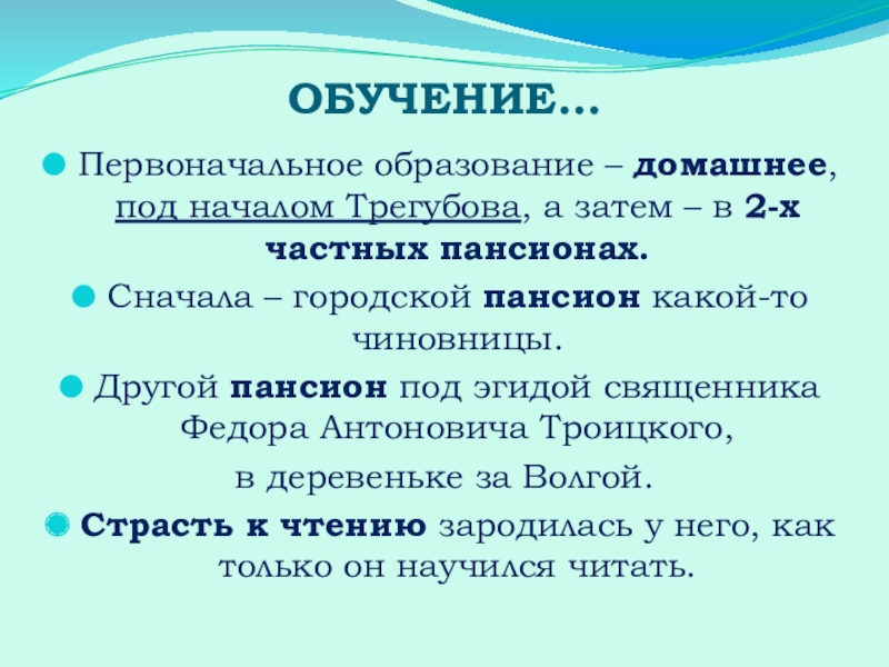 Первоначальное образование – домашнее, под началом Трегубова, а затем – в