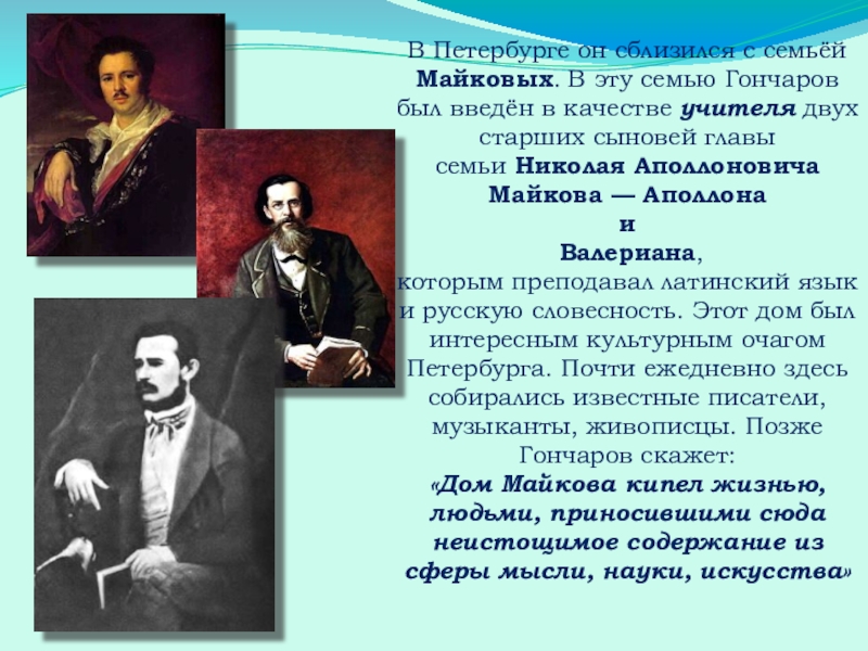 Слайд 14В Петербурге он сблизился с семьёй Майковых. В эту семью Гончаров