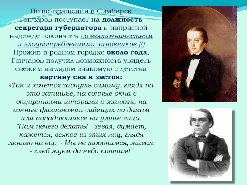 Симбирск той поры, впоследствии по словам Гончарова, был «сонным царством».