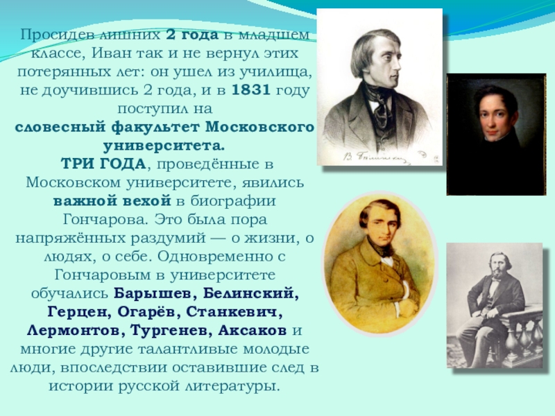 ТРИ ГОДА, проведённые в Московском университете, явились важной вехой в биографии Гончарова. Это была пора напряжённых раздумий — о жизни, о людях, о себе. Одновременно с Гончаровым в университете обучались Барышев, Белинский,