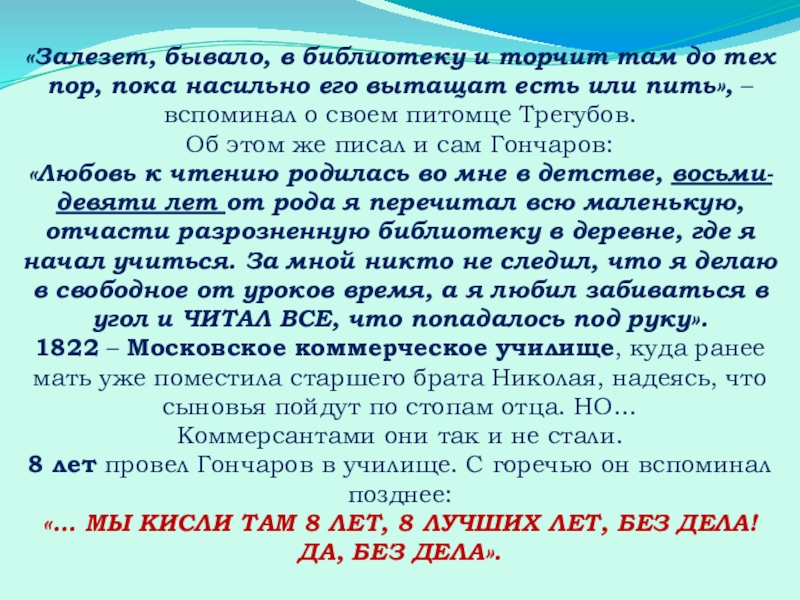 8 лет провел Гончаров в училище. С горечью он вспоминал позднее:
