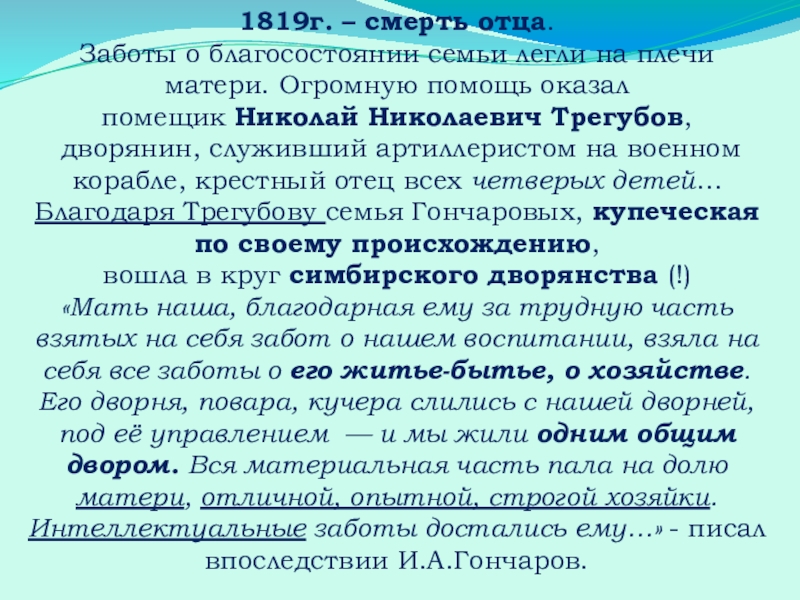 «Мать наша, благодарная ему за трудную часть взятых на себя забот о нашем воспитании, взяла на себя все заботы о его житье-бытье, о хозяйстве. Его дворня, повара, кучера слились с нашей дворней, под её управлением — и мы жили одним общим двором. Вся материальная часть пала на долю матери, отличной, опытной, строгой хозяйки. Интеллектуальные заботы достались ему…» - писал впоследствии И.А.Гончаров.