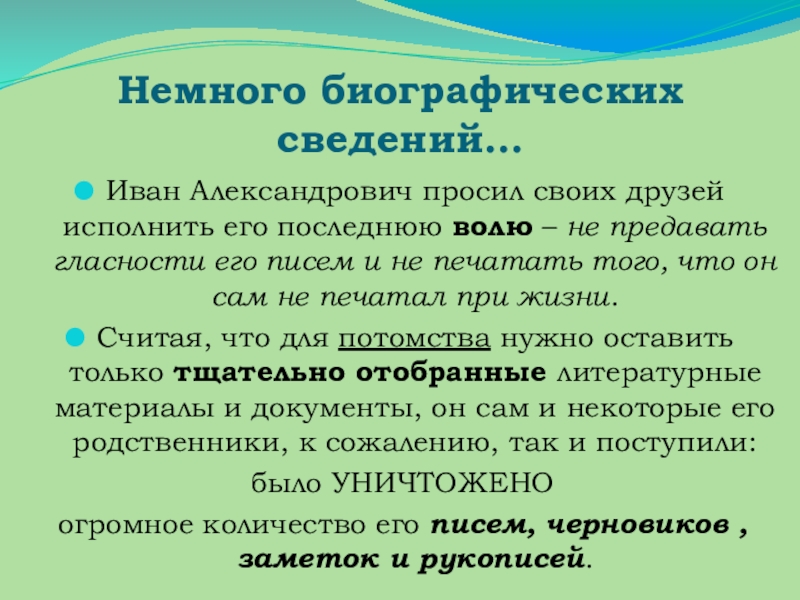Считая, что для потомства нужно оставить только тщательно отобранные литературные материалы и документы, он сам и некоторые его родственники, к сожалению, так и поступили: