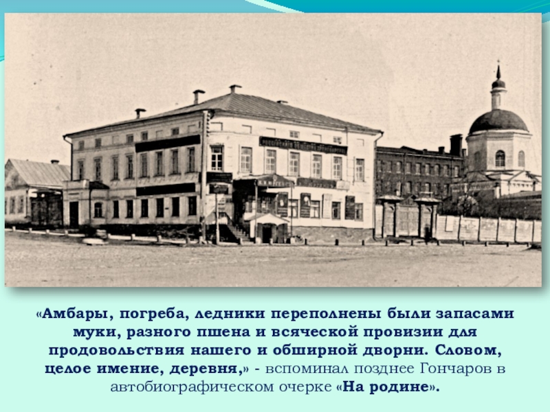 провизии для продовольствия нашего и обширной дворни. Словом, целое имение, деревня,» - вспоминал позднее Гончаров в автобиографическом очерке «На родине».