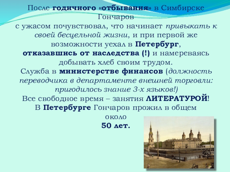 Слайд 13После годичного «отбывания» в Симбирске Гончаров