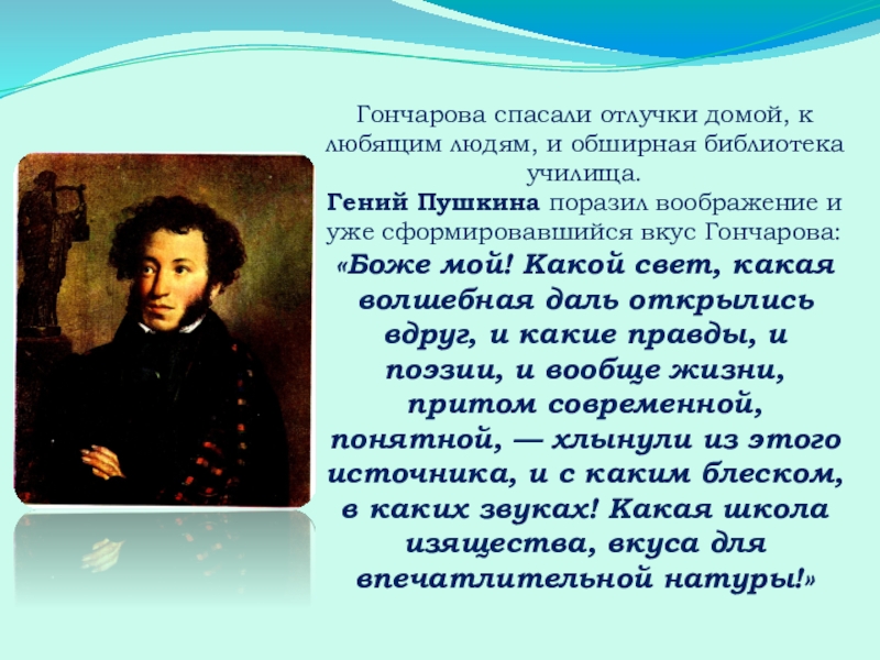 Гений Пушкина поразил воображение и уже сформировавшийся вкус Гончарова: