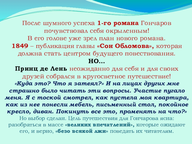 Слайд 16После шумного успеха 1-го романа Гончаров почувствовал себя окрыленным!