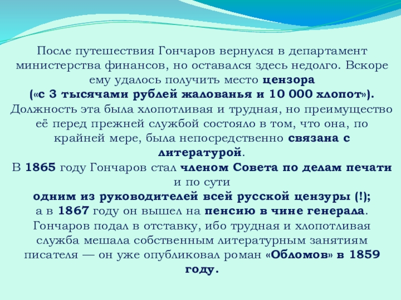 а в 1867 году он вышел на пенсию в чине генерала. Гончаров подал в отставку, ибо трудная и хлопотливая служба мешала собственным литературным занятиям писателя — он уже опубликовал роман «Обломов» в 1859 году.