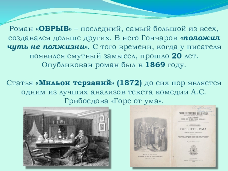 Слайд 25Роман «ОБРЫВ» – последний, самый большой из всех, создавался дольше других.
