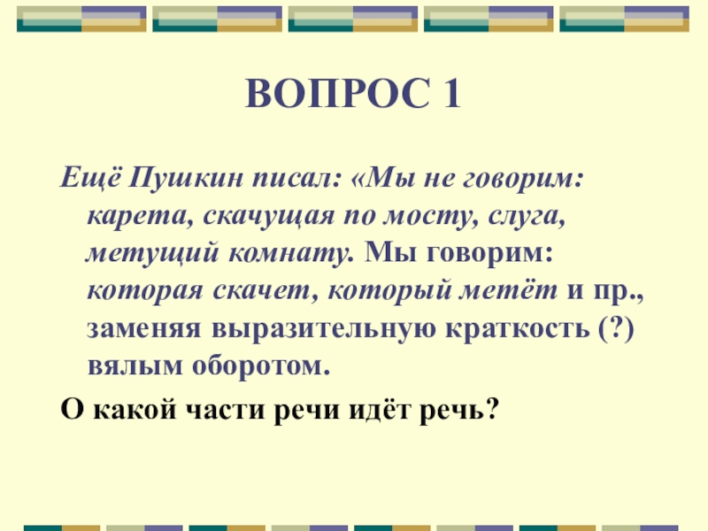 слуга, метущий комнату. Мы говорим: которая скачет, который метёт и пр., заменяя выразительную краткость (?) вялым оборотом.