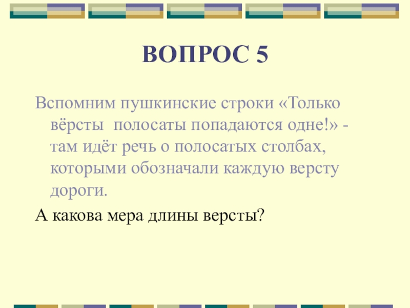 Вспомним пушкинские строки «Только вёрсты полосаты попадаются одне!» - там