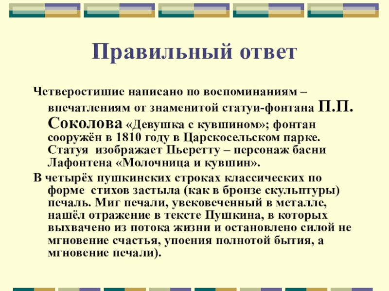 Четверостишие написано по воспоминаниям –впечатлениям от знаменитой статуи-фонтана П.П.Соколова «Девушка