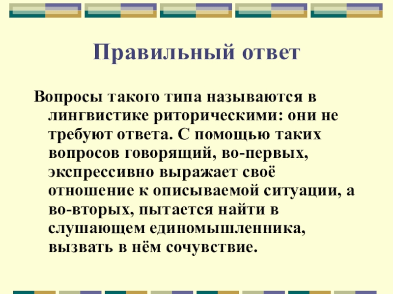 ответа. С помощью таких вопросов говорящий, во-первых, экспрессивно выражает своё отношение к описываемой ситуации, а во-вторых, пытается найти в слушающем единомышленника, вызвать в нём сочувствие.