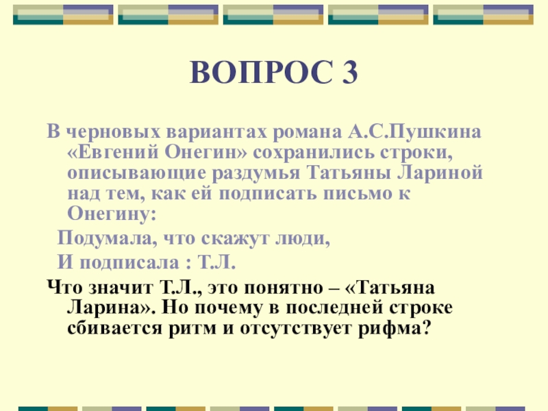 Что значит Т.Л., это понятно – «Татьяна Ларина». Но почему в последней строке сбивается ритм и отсутствует рифма?