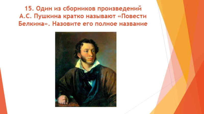 Слайд 1615. Один из сборников произведений А.С. Пушкина кратко называют «Повести Белкина».