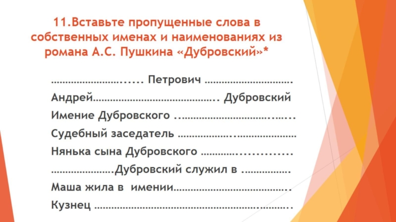 11.Вставьте пропущенные слова в собственных именах и наименованиях из романа А.С. Пушкина «Дубровский»*