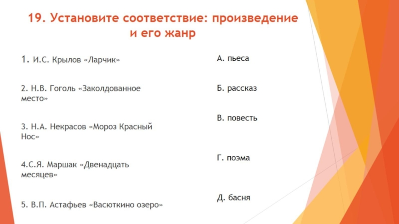 Слайд 2019. Установите соответствие: произведение и его жанр