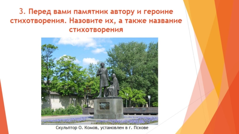 3. Перед вами памятник автору и героине стихотворения. Назовите их, а также название стихотворения