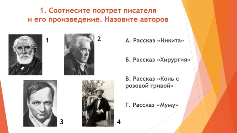 1. Соотнесите портрет писателя и его произведение. Назовите авторов